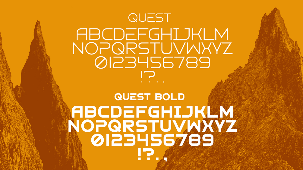 Quest is a Display font. A simple futuristic font with 2 weights. Regular and Bold